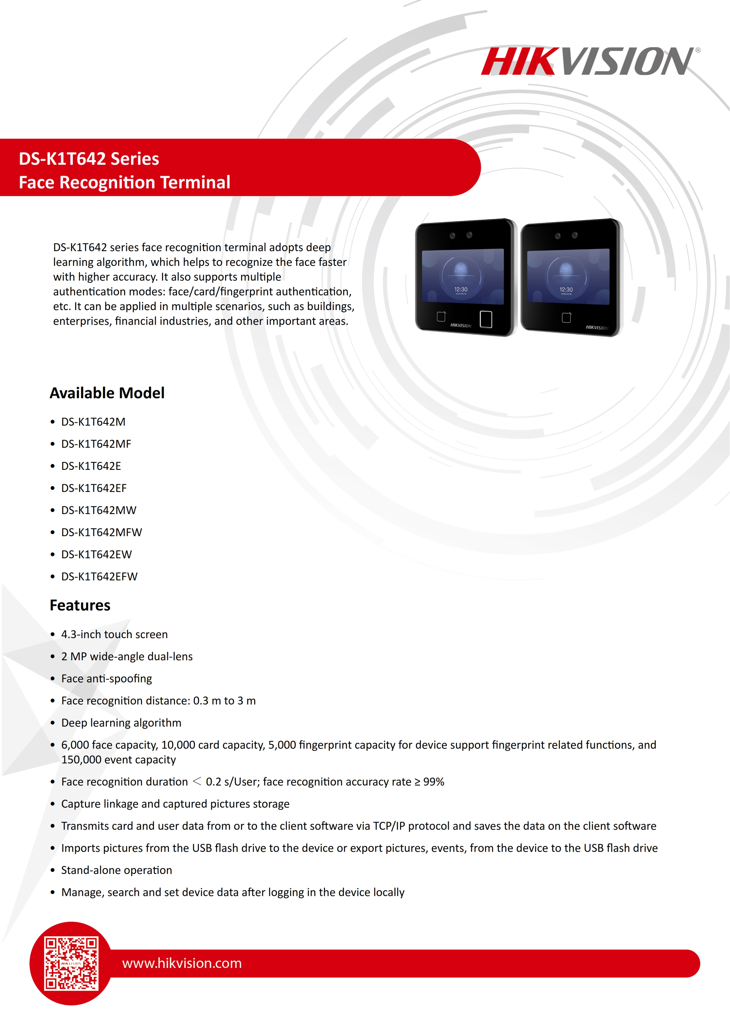 เครื่องจดจำใบหน้าที่ใช้อัลกอริธึมการเรียนรู้เชิงลึก ซึ่งช่วยให้จดจำใบหน้าได้เร็วขึ้น ด้วยความแม่นยำที่สูงขึ้น นอกจากนี้ยังรองรับหลายโหมดการตรวจสอบความถูกต้อง: การตรวจสอบใบหน้า / บัตร / ลายนิ้วมือ, ฯลฯ สามารถนำไปใช้ได้หลากหลายสถานที่ เช่น อาคารสำนักงาน หน่วยงานราชการ รัฐวิสาหกิจ อุตสาหกรรม การเงินและพื้นที่สำคัญอื่น ๆ